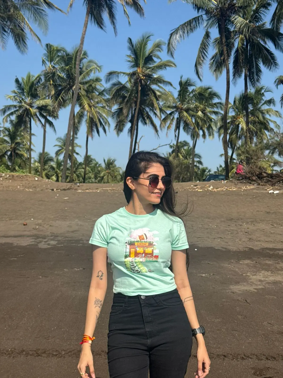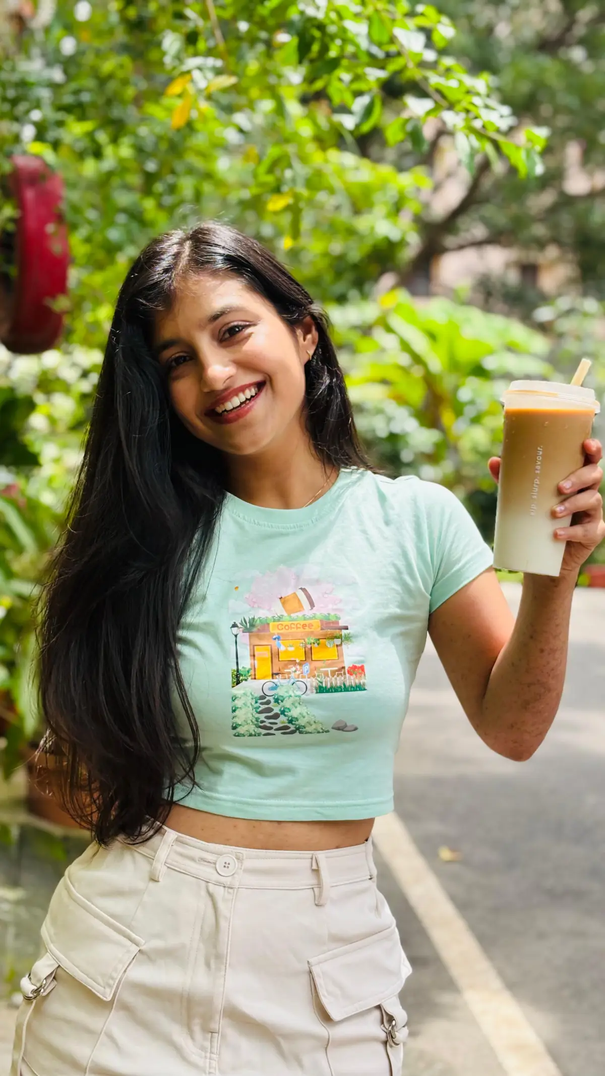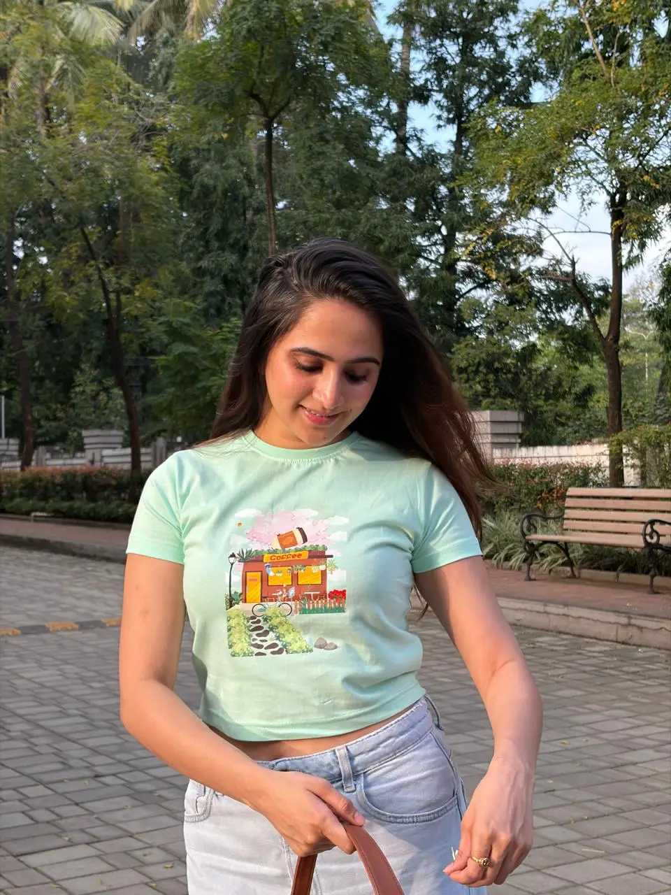 This mint green crop top is such a cute find The little coffee shop print instantly caught my eye it’s so vibrant and full of detail, like a tiny scene from a cozy morning. It genuinely makes me smile every time I wear it. The color is super refreshing and looks great with everything from denim to skirts.