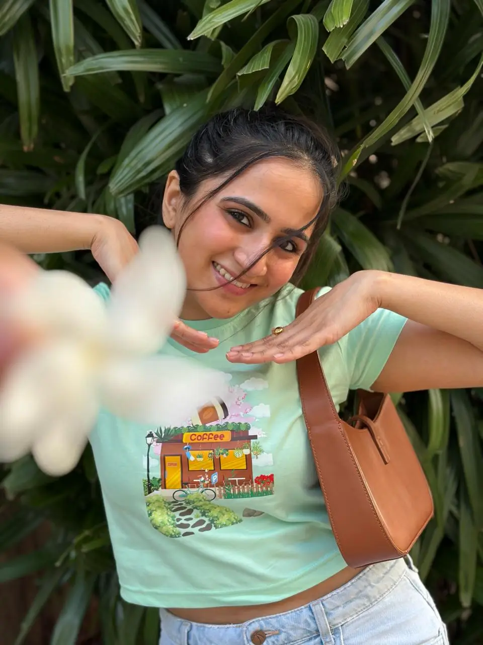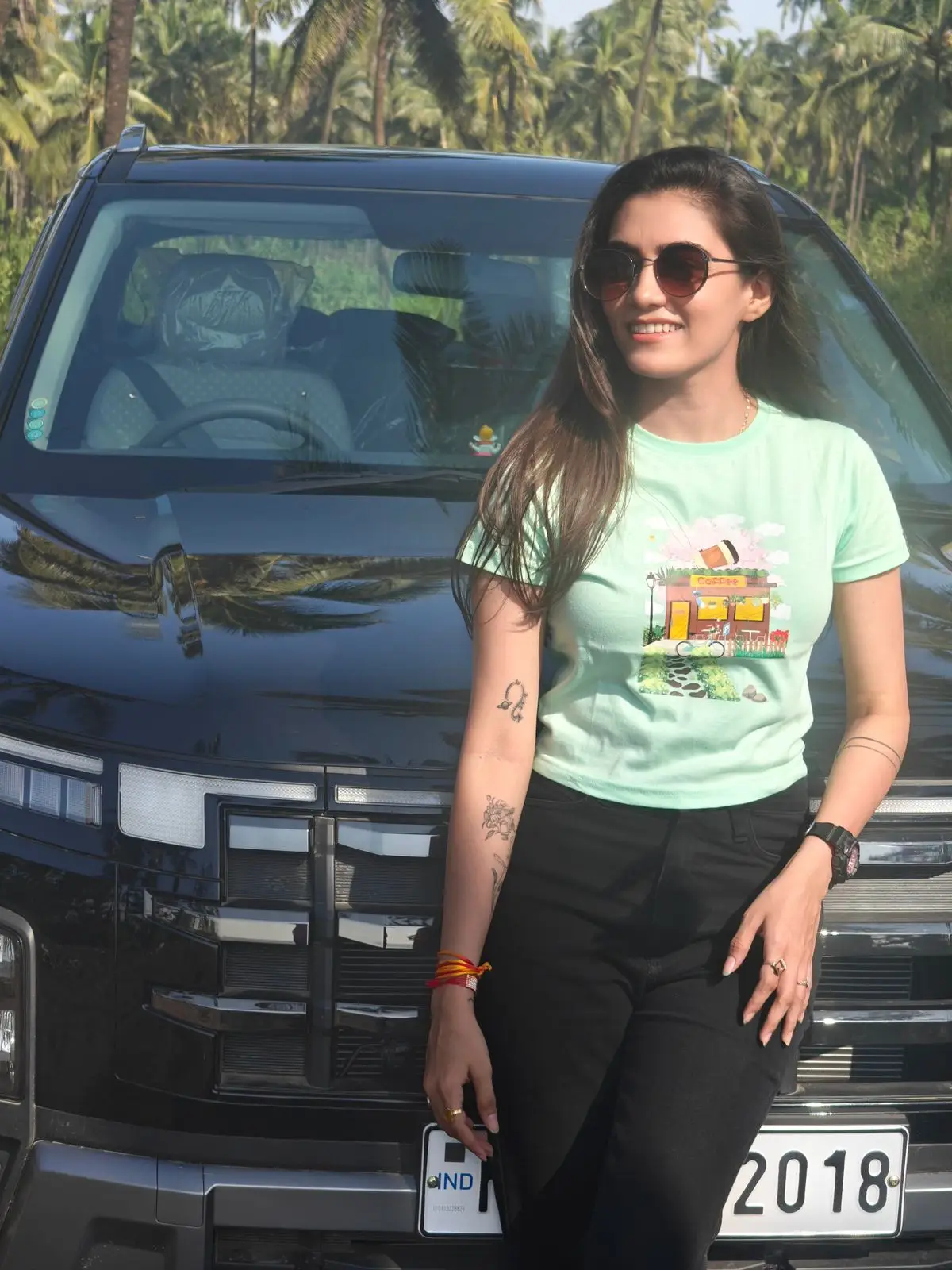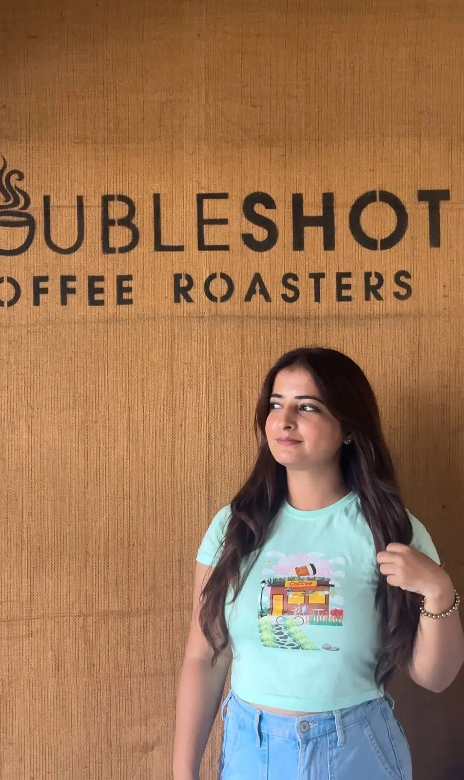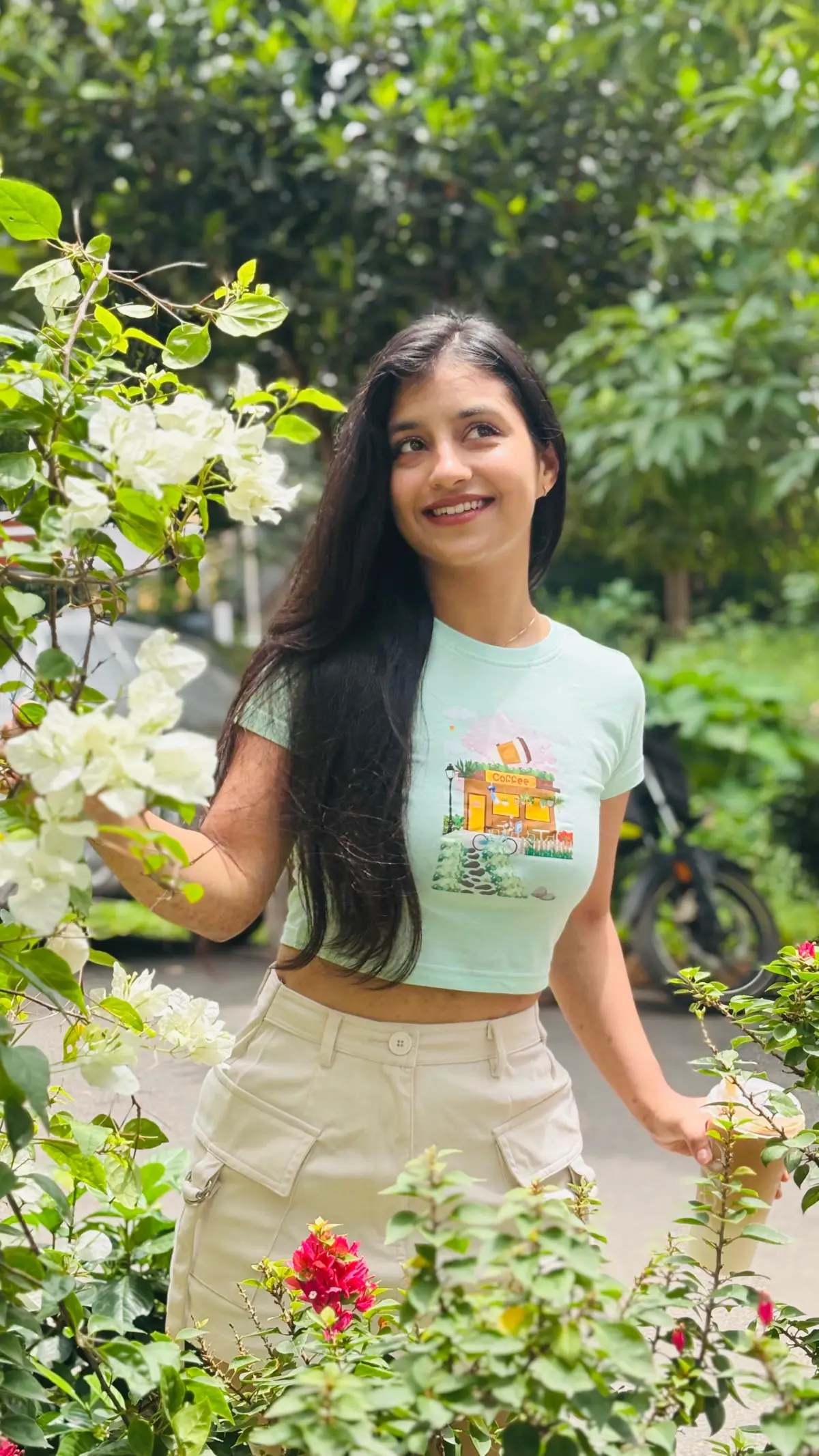 This mint green crop top is such a cute find The little coffee shop print instantly caught my eye it’s so vibrant and full of detail, like a tiny scene from a cozy morning. It genuinely makes me smile every time I wear it. The color is super refreshing and looks great with everything from denim to skirts.