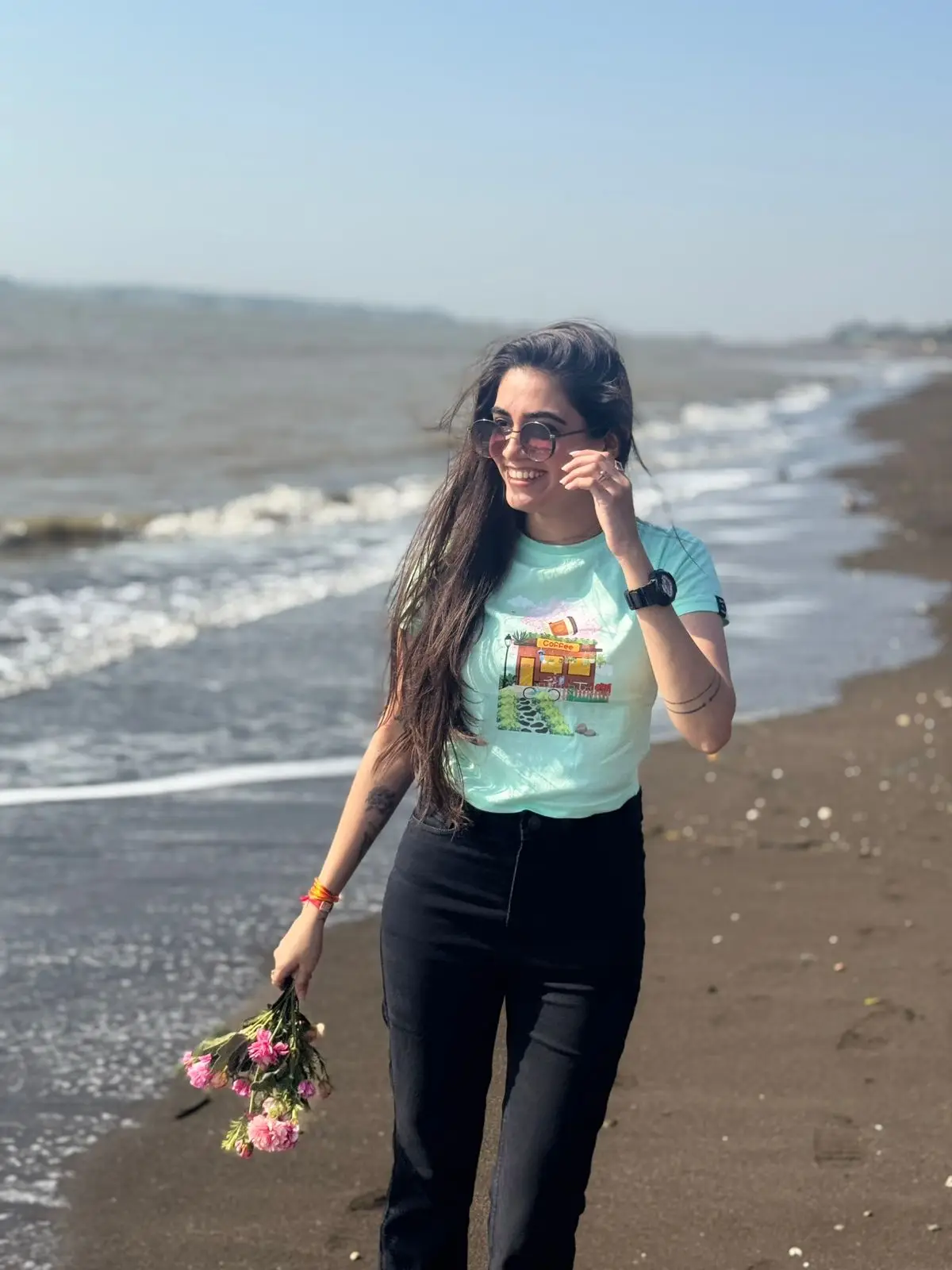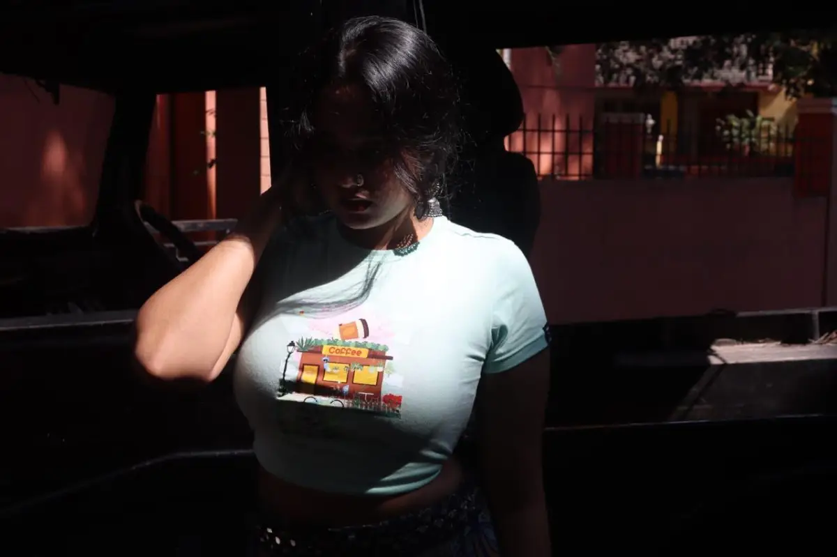 The color is soft and dreamy, and the little coffee shop print is straight-up adorable it feels like wearing a doodle out of a storybook. It’s light, airy, and fits just right, so you don’t have to keep adjusting it while you’re out. It’s one of those tops that just makes you feel effortlessly cute without even trying.