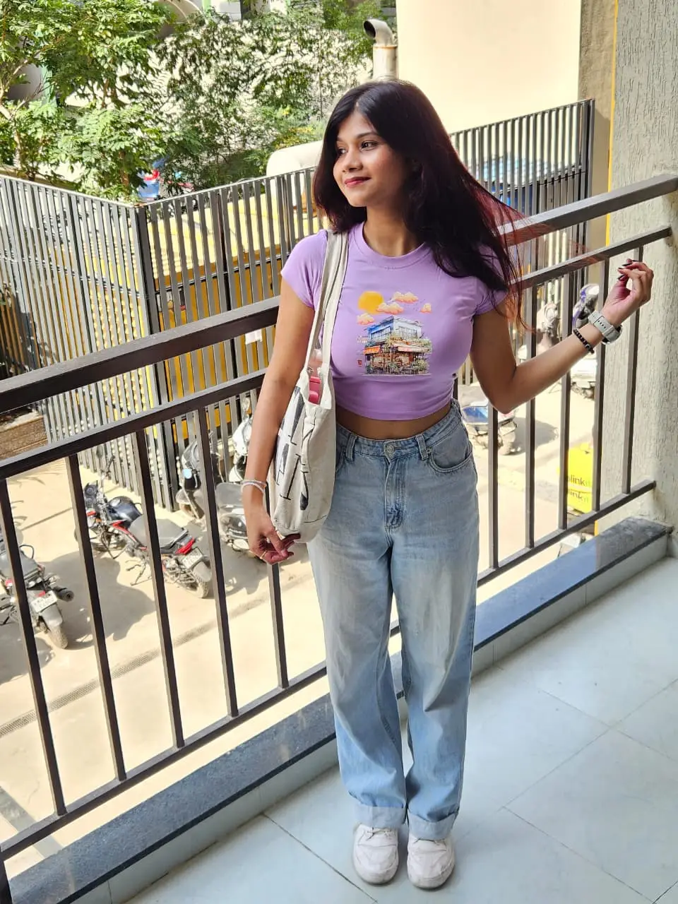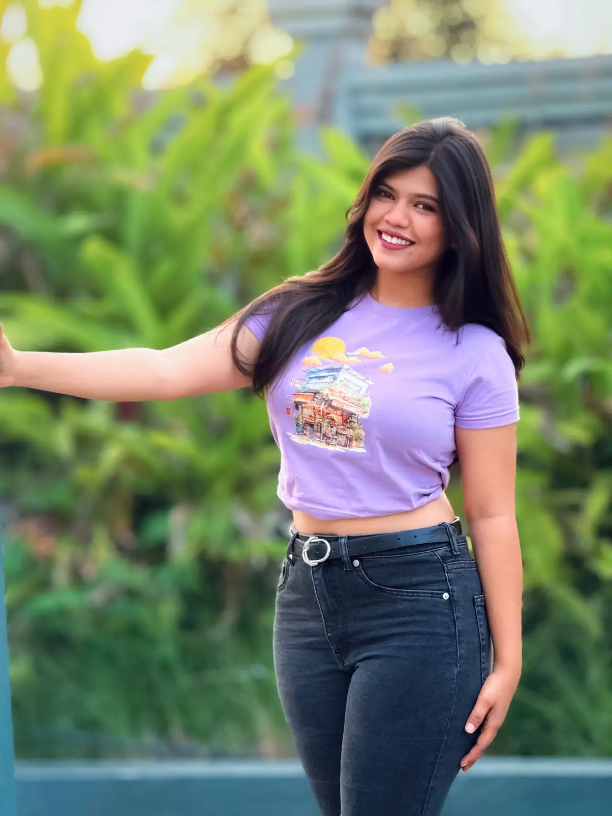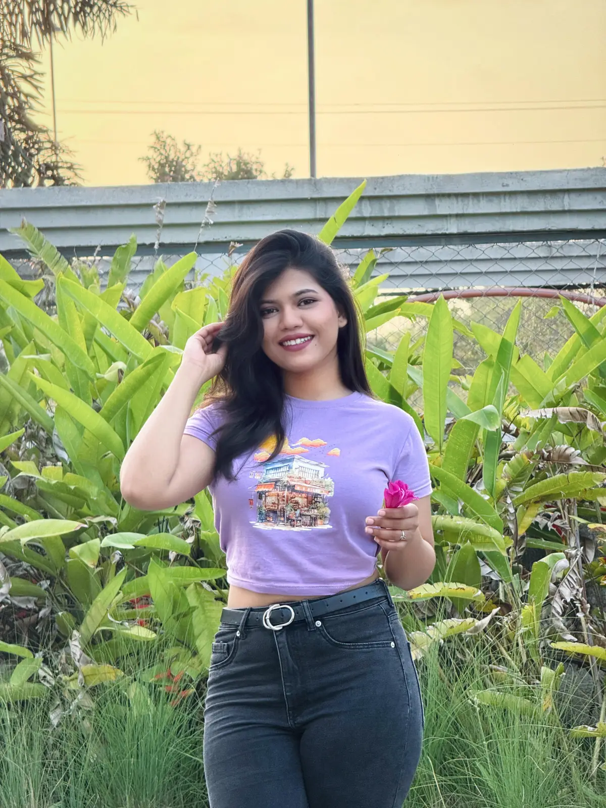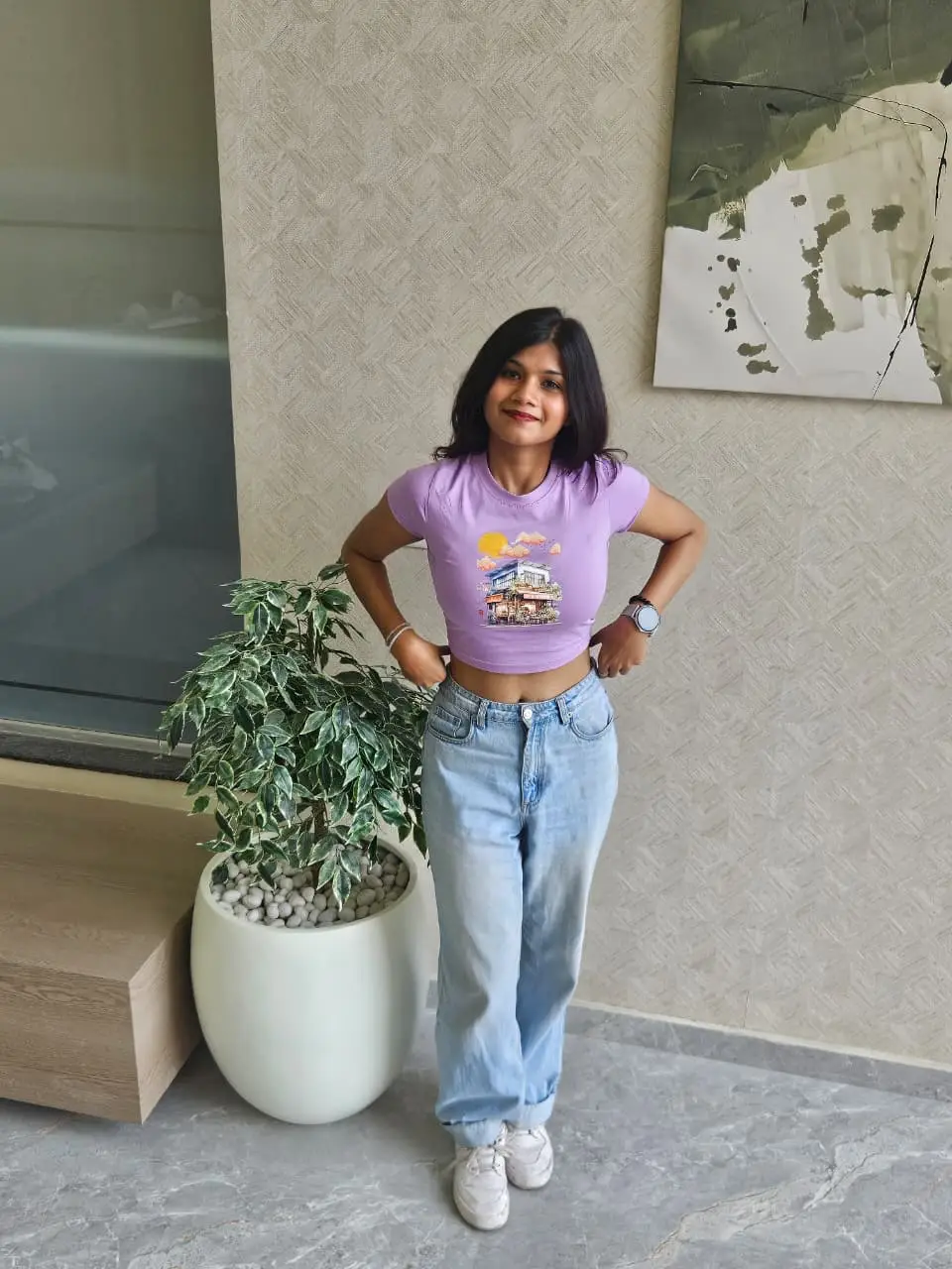 Bring calm street-style aesthetics to your wardrobe with the Japanese Cafe Crop Top from Space n Ocean. This slim-fit lavender crop top features a detailed artwork inspired by cozy Japanese cafes, warm sunsets, and peaceful city corners. Crafted with soft stretch fabric for a flattering fit, it blends comfort with artistic fashion, perfect for everyday wear, cafe outings, and aesthetic street looks.
