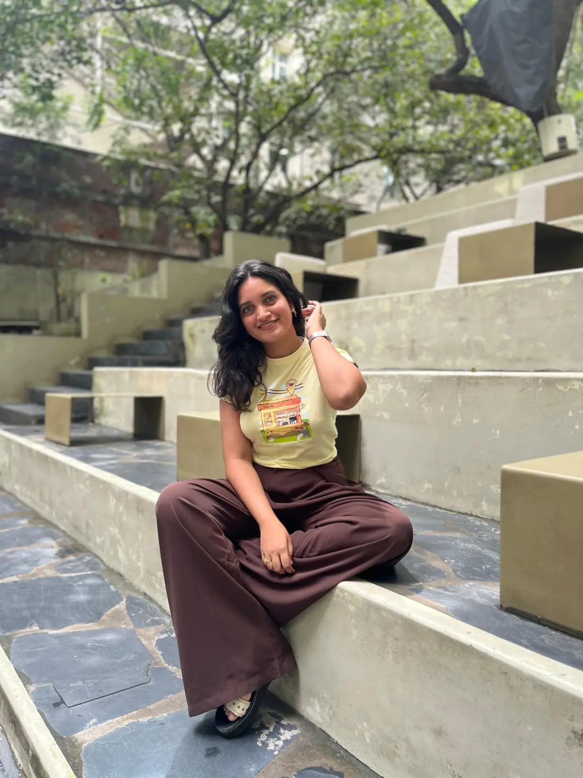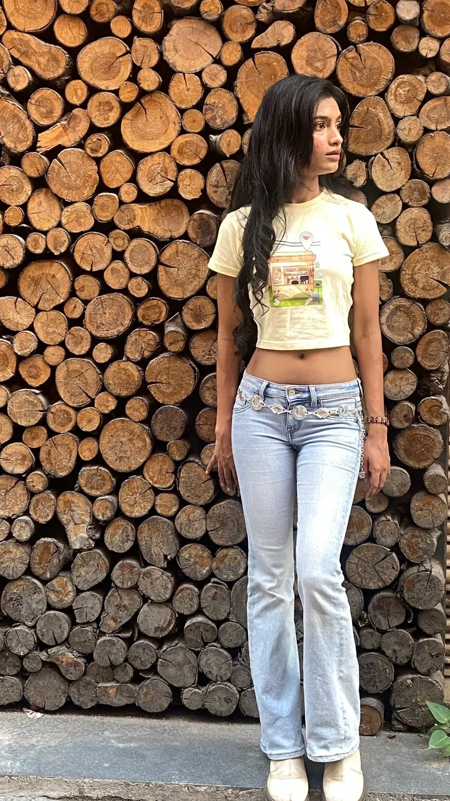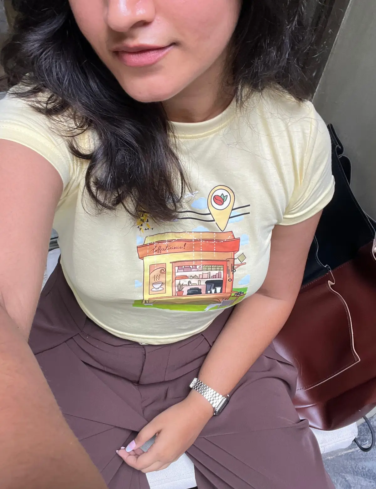 I absolutely love how this crop top stands out without trying too hard. The soft yellow shade feels fresh and summery, and the little cafe graphic adds such a fun, playful touch. It’s super easy to dress up or down I wore it with flared jeans and boots, and the look was effortlessly cool. The material is lovely