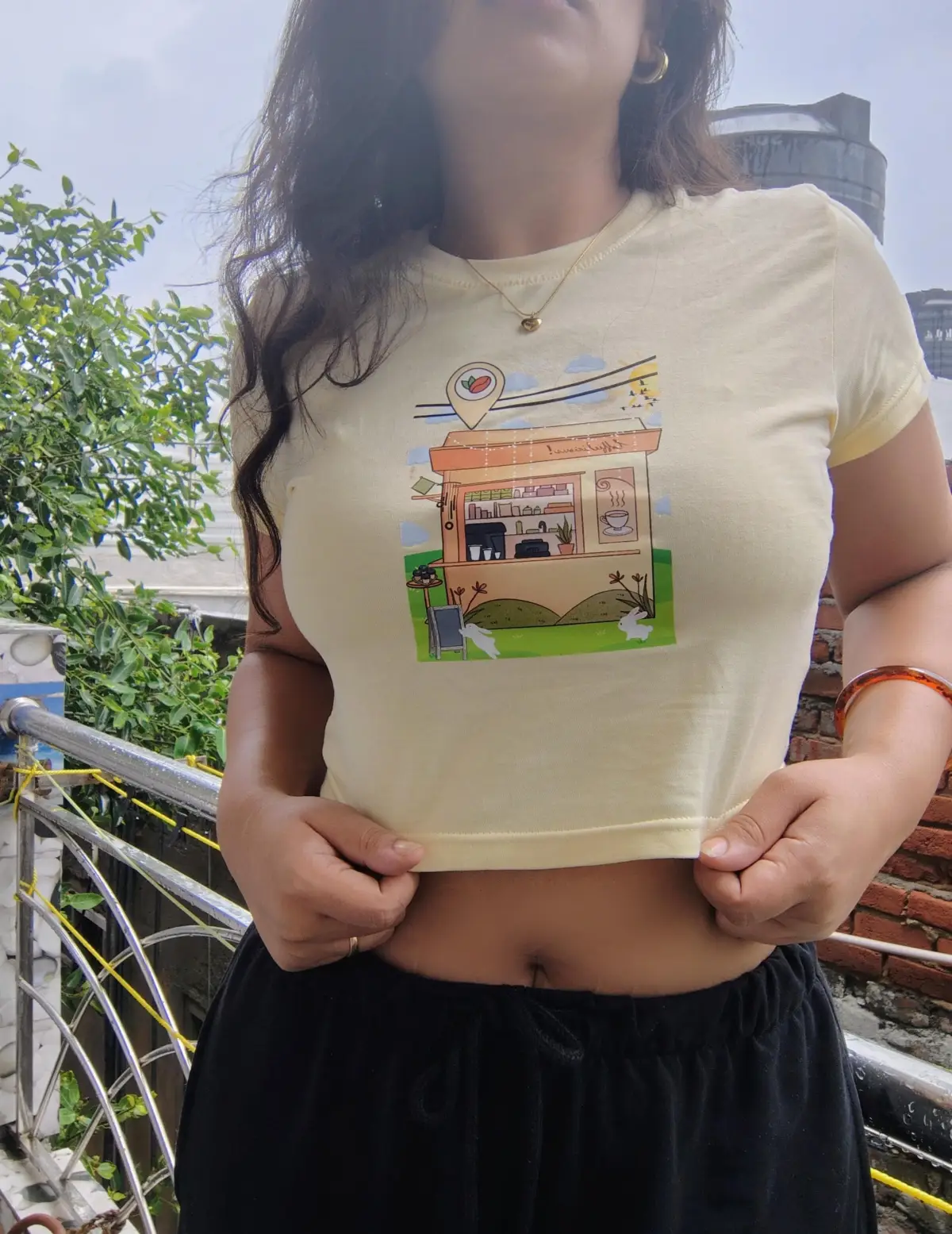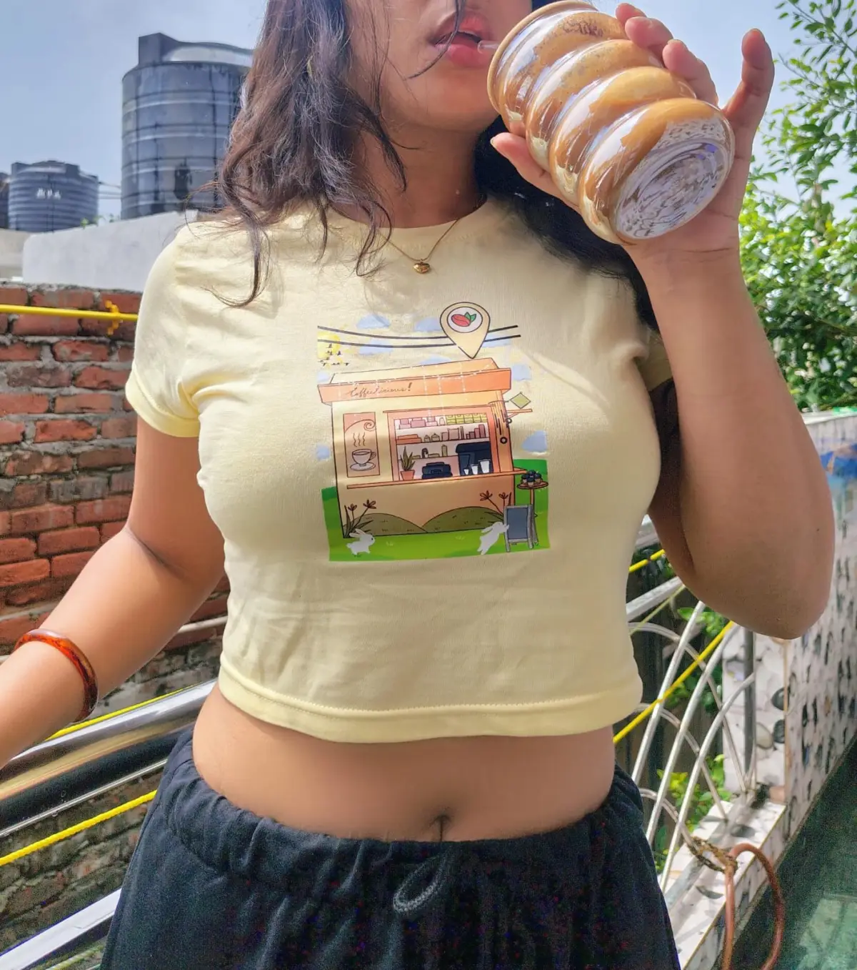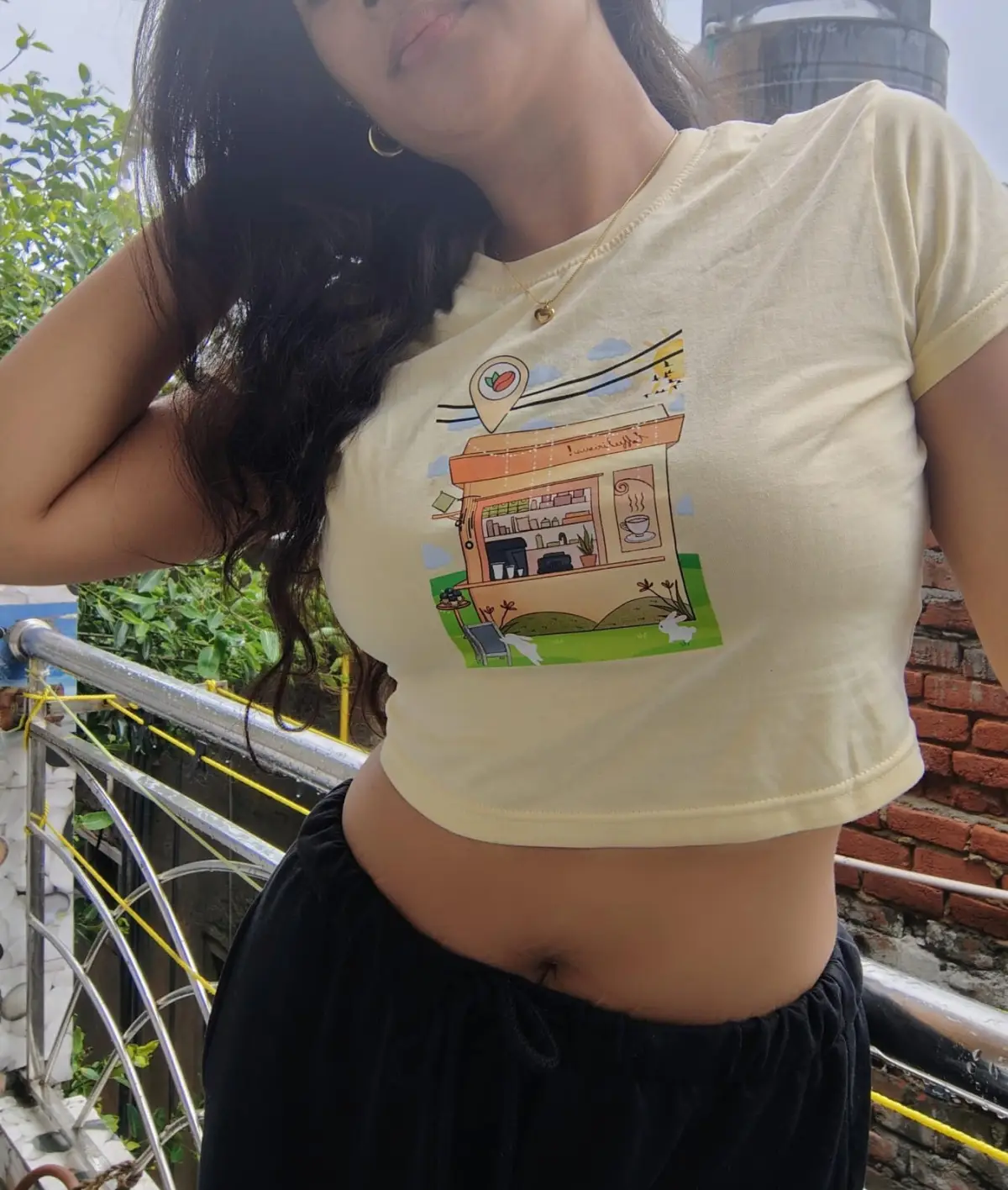 I really loved this yellow café coffee printed crop top. The color looks very fresh and happy, and the little coffee shop design in the center makes it look super cute and aesthetic. The fabric feels soft and comfortable, and the fit is very flattering
