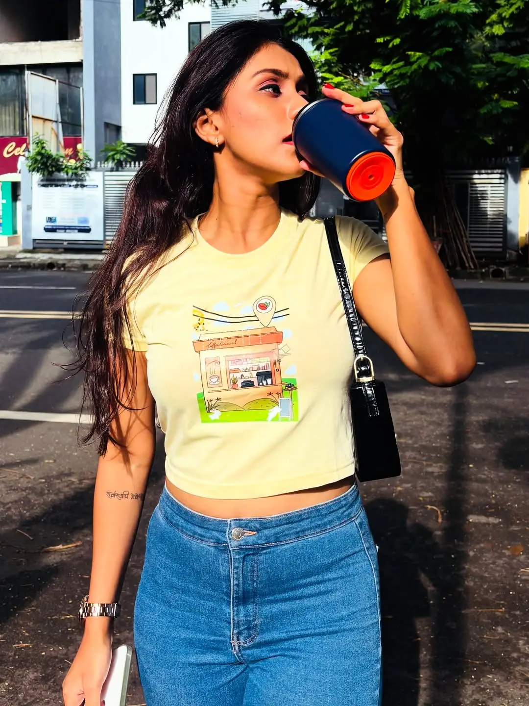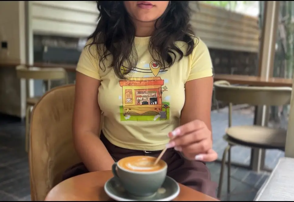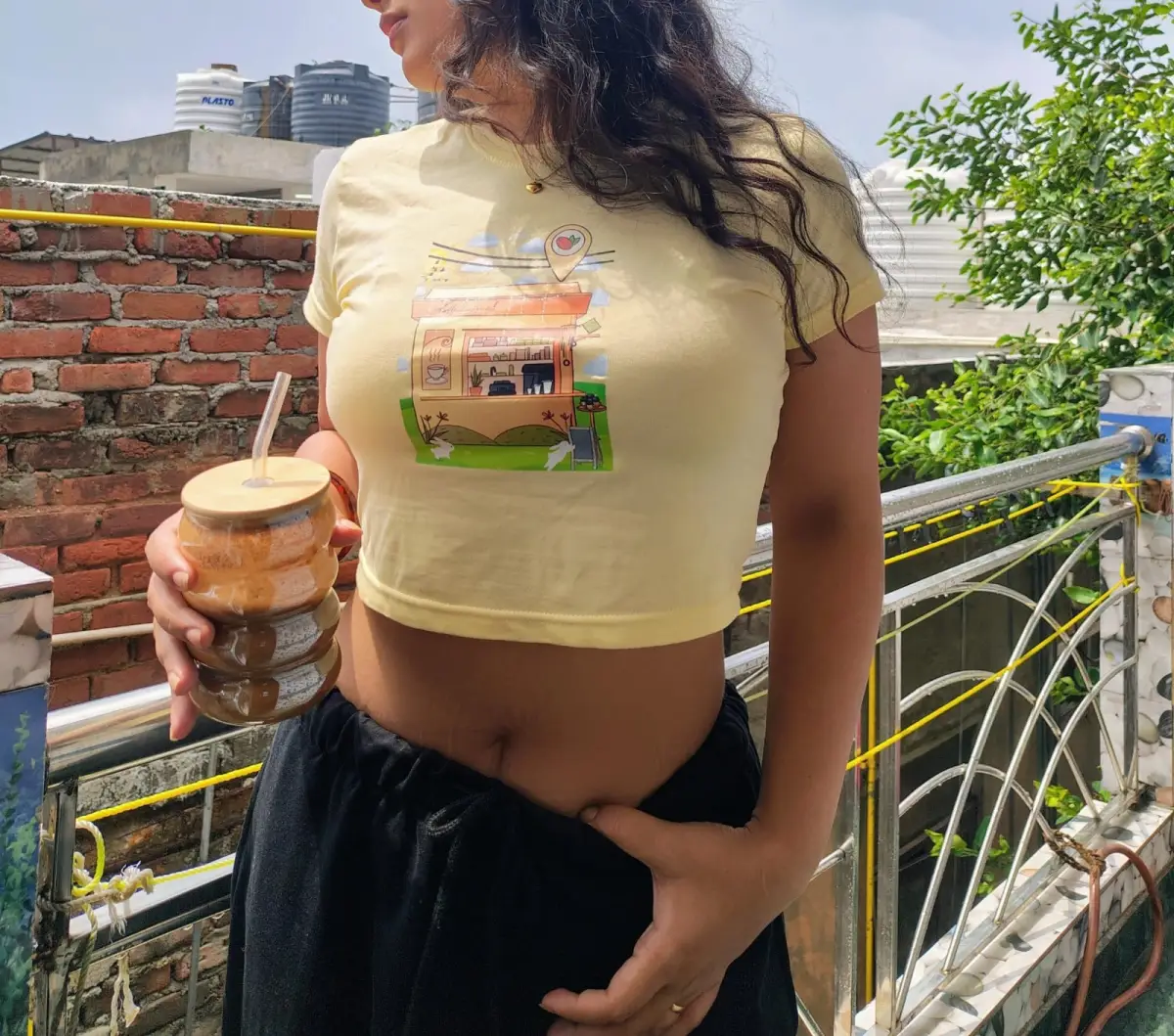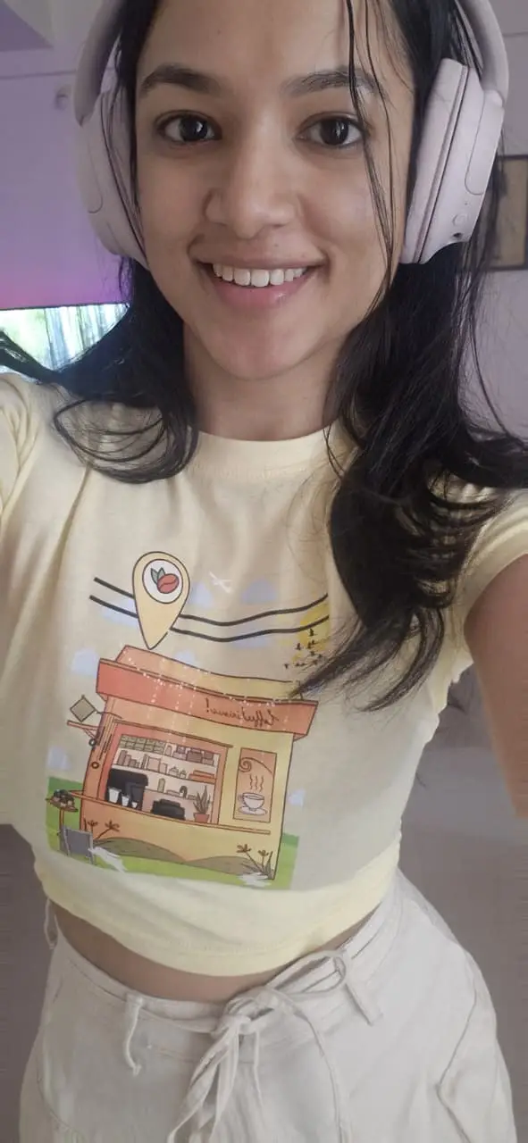 I really loved this yellow café coffee printed crop top. The color looks very fresh and happy, and the little coffee shop design in the center makes it look super cute and aesthetic. The fabric feels soft and comfortable, and the fit is very flattering