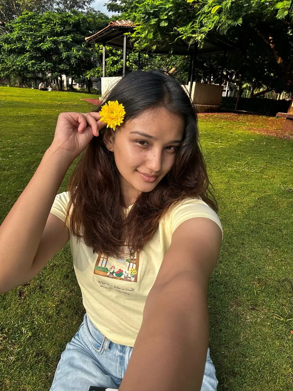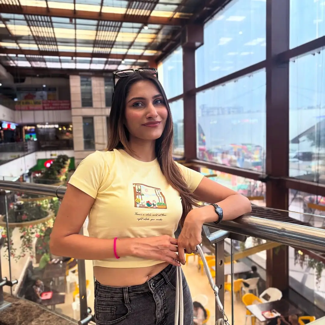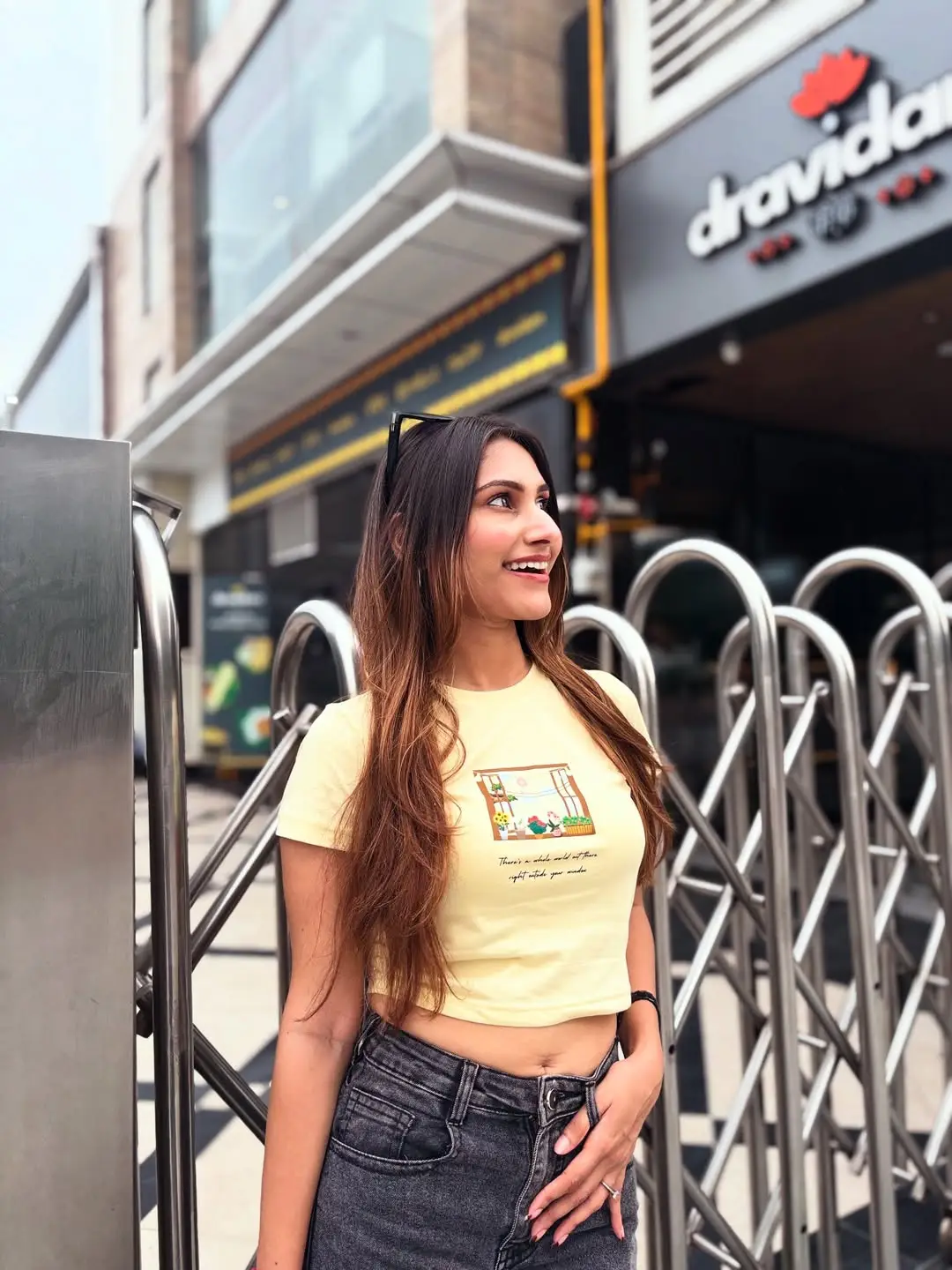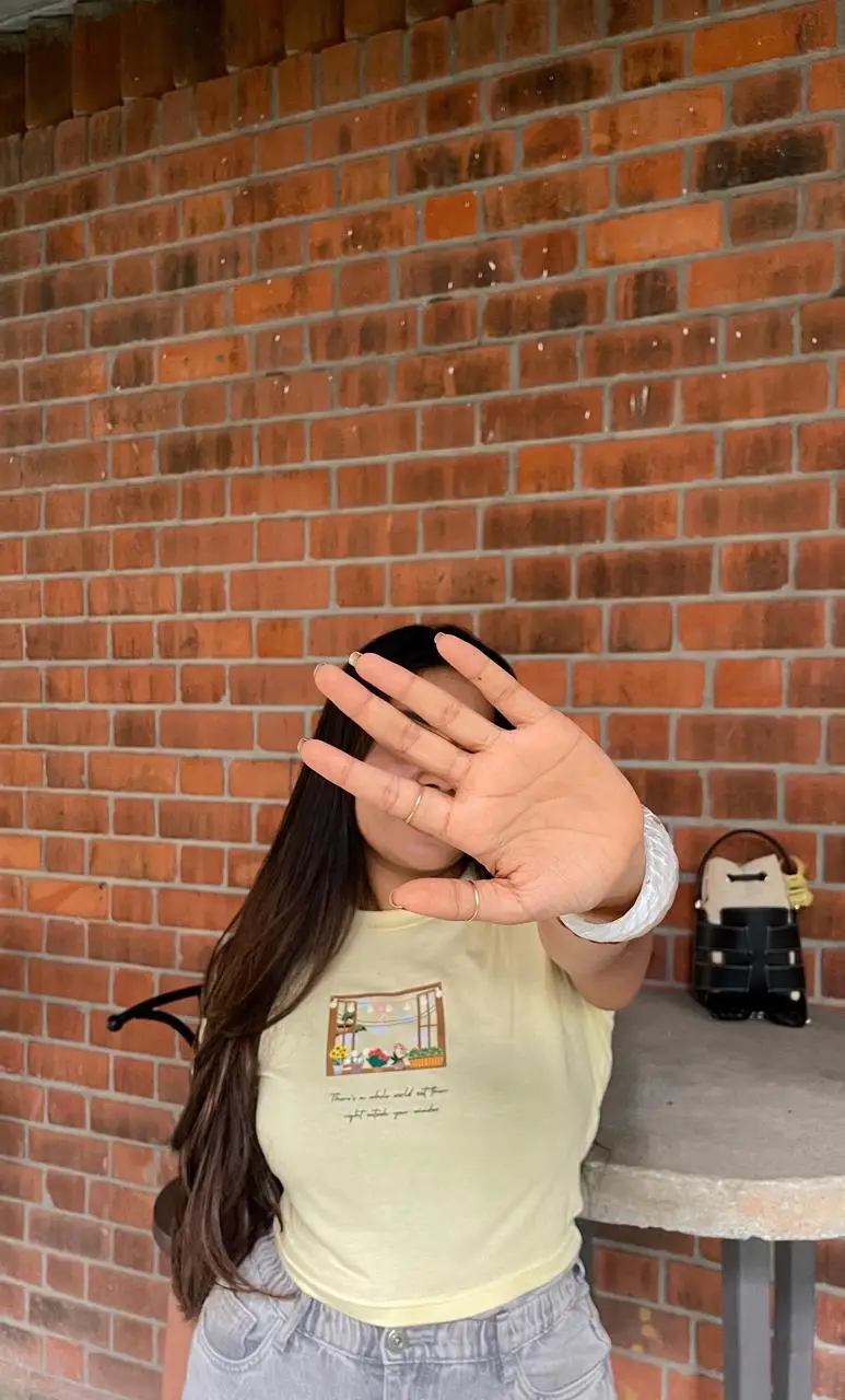 I bought this yellow window print crop top because I wanted something minimal but different, and this one turned out really good. The color has a soft pastel tone which looks very pleasant outdoors, and the small window graphic gives it a cute artistic touch instead of looking too loud.